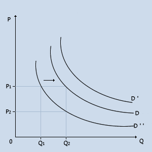Эти факторы способствуют сдвигу кривой индивидуального спроса вправо или влево. Так, изменение денежных доходов потребителей предполагает сдвиг кривой в положение D' (в случае их увеличения) и в положение D" (в случае их снижения).