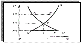 В точке Е спрос равен предложению (Q 1) и цена (P 1) выступает как цена равновесия. При более высокой цене Р 2 возникает избыток предложения над спросом (равный по величине отрезку АВ). Этот избыток в результате конкуренции продавцов будут способствовать снижению цены. При цене ниже уравновешивающей (р з) спрос превышает предложение (отрезок CF). В этом случае излишек спроса и конкуренция покупателей будет толкать цену вверх. Лишь в точке Е достигается равновесие сил и устойчивая цена, которая может сохраняться.