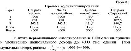 Рассмотрим процесс мультиплицирования на простом примере. Допустим, что инвестиции в обществе возросли на 1000 единиц. С одной стороны – это расходы. С другой доходы. Эти денежные средства материализуются в виде рабочей силы, оборудования, сырья и других товаров. Владельцы этих факторов производства получат доход, также равный 1000 ед. При MPC=0,75 они направят на потребление 750 единиц, а на сбережения – 250 единиц. 750 единиц также для кого-то станут расходами, а для кого-то доходами (см. табл.9.1)