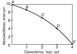 Упрощенно представим, что страна производит только два товара — автомобили и самолеты. Если она сконцентрирует все свои экономические ресурсы на выпуске только автомобилей, она сможет за год выпустить их 10 млн шт. Если ей надо производить также 1 тыс. самолетов, то это возможно при сокращении выпуска автомобилей до 9 млн шт. Для производства 2 тыс. самолетов придется сократить выпуск автомобилей до 7 млн шт., а для производства 3 тыс. самолетов — до 4 млн шт. При производстве 4 тыс. самолетов страна вынуждена вообще отказаться от выпуска автомобилей.
