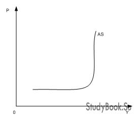 Третий участок отражает состояние экономики, при котором ее производственные возможности практически полностью использованы. Это выражается в полной занятости, максимальная загрузка производственных мощностей, следовательно невозможности дальнейшего роста производств. Так как экономика работает на полную мощность, то любое повышение цен не приведет к увеличению реального объема производства.