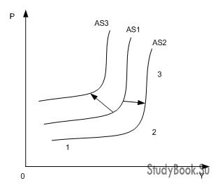 Кривая AS устанавливает зависимость между уровнем цен и реальным объемом национального производства при прочих равных условиях (неценовых факторов совокупного предложения). Когда эти условия меняются, происходит смещение кривой.