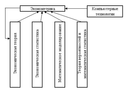 Эконометрика занимает свою нишу научных и прикладных исследований на стыке экономической теории, экономической статистики, математического моделирования, теории вероятностей и математической статистики. Связь эконометрики с отмеченными научными дисциплинами проявляется по-разному: