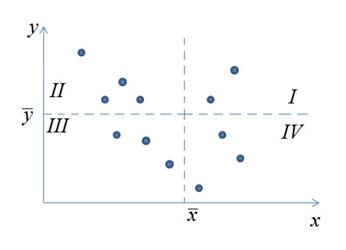 Тогда вертикальная и горизонтальная прямые, проведенные через нее, разделяют плоскость поле на четыре области. Положительный вклад в ковариацию формируется в областях I и III, а отрицательный – в областях II и IV. Если положительные вклады преобладают над отрицательными, то ковариация будет положительной, а большинство точек поля будет сосредоточено в областях I и III, группируясь возле возрастающей прямой.