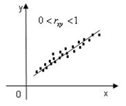 связь между факторами x и y прямая, т.е. большим значениям x соответствуют большие значения y;