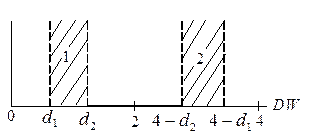 – граница признания отсутствия автокорреляции остатков; 1 – зона неопределенности в случае предполагаемой положительной автокорреляции; 2 – зона неопределенности в случае предполагаемой отрицательной автокорреляции.