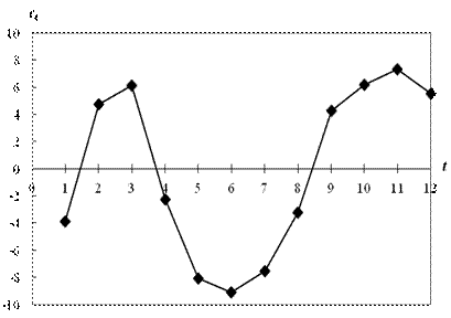 2. Построим график временного ряда остатков регрессии (рисунок 5.8) и проведем его визуальный анализ. В таблице 5.5 приведены наблюдаемые