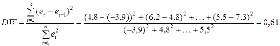 Визуальный анализ графика 5.8 указывает на положительную автокорреляцию остатков: видно, что на графике имеются чередующиеся зоны положительных и отрицательных остатков регрессии. Проверим это предположение методом Дарбина-Уотсона. Определяем