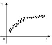 В результате структурного сдвига, начиная с некоторого момента времени t, происходит изменение в развитии самого изучаемого показателя, а следовательно, изменяется поведение тренда, описывающего его развитие, например, на смену линейному характеру развития приходит кусочно-линейный.