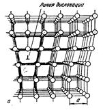 Линейные дефекты характеризуются малыми размерами в двух измерениях, но имеют значительную протяженность в третьем измерении. Важнейший вид линейных дефектов - дислокации. Вокруг дислокаций решетка упруго искажена. Плотность дислокаций - суммарная длина всех линий дислокаций в единице объема. Дислокации значительно влияют на свойства материалов, участвуют в фазовых превращениях, рекристаллизации, служат готовыми центрами при выпадении второй фазы из твердого раствора, влияют на прочность кристаллов, увеличивая ее в несколько раз по сравнению с отожженным состоянием. На рис.6 представлен один из видов линейной дислокации.