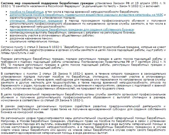 Специальным нормативным правовым актом, регламентирующим отношения в области занятости и трудоустройства, является Закон РФ "О занятости населения в Российской Федерации" от 19 апреля 1991 года с последующими изменениями и дополнениями. Первая глава названного Закона посвящена общим положениям, в ней даны понятия "занятость", "безработный", "подходящая работа", а также определены основные направления государственной политики в области занятости и основополагающие права органов государственной власти и органов местного самоуправления.