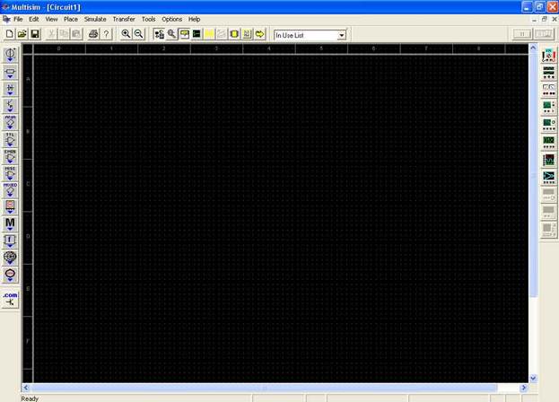 При запуске Multisim появляется рабочее поле, слева от которого находится панель с базами элементов, а справа набор измерительных приборов.