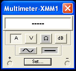 На схеме мультиметр представлен в свёрнутом виде. Чтобы увидеть значение измеряемой величины необходимо его развернуть. Мультиметр в развёрнутом виде представлен слева. Кнопки A, V, Ω и dB задают режим работы (амперметр, вольтметр, омметр и измеритель напряжения в децибелах соответственно). Ниже изменяется характер измеряемой величины (постоянный или переменный ток). Кнопка Set вызывает установки мультиметра, в которые входят его внутреннее сопротивление и ток омметра.