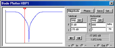 Кнопки Magnitude и Phase позволяют переключать Bode Plotter между режимами анализатора АЧХ и анализатора ФЧХ соответственно. Кнопка Save позволяет сохранять снятые данные на диске. Кнопка Set вызывает окно установки, в котором вы можете изменять точность анализа, задавая число снимаемых точек.