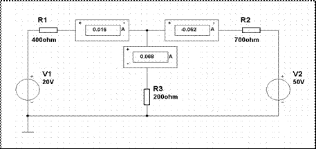 Проведение компьютерного моделирования к расчёту по методу наложения в Multisim состоит из трёх этапов. На первом этапе требуется собрать заданную схему и измерить токи в ветвях. В качестве примера возьмём цепь, имеющую три ветви и два источника ЭДС.