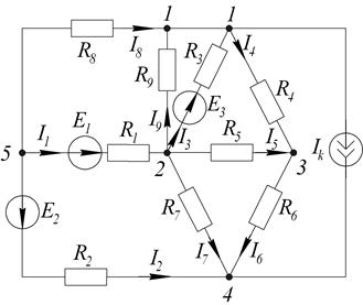Произвольно выбираем направление токов в ветвях и направление обхода контуров. В схеме шесть ветвей. Необходимо составить систему из