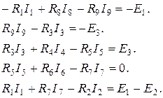 Недостающие пять уравнений составляем по второму закону Кирхгофа для явно выраженных контуров:
