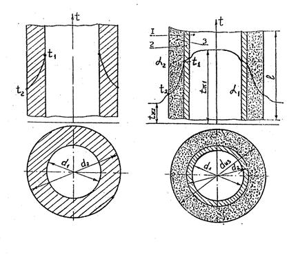 | Рис. 1. Однородная цилиндрическая стенка | Рис.2. Схема однослойной тепловой изоляции |
