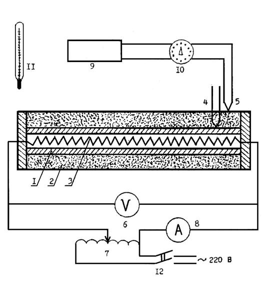 1-металлическая труба; 2-слой изоляции; 3-нагревательный элемент; 4-термопары на внутренней поверхности изоляции; 5- термопары на наружной поверхности изоляции; 6-вольтметр; 7-автотрансформатор (ЛАТР); 8-амперметр; 9-измеритель температуры; 10-переключатель термопар; 11-ртутный термометр; 12-выключатель сети.