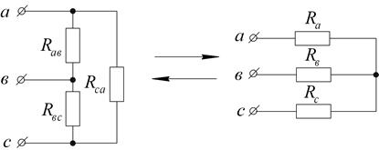 Преобразование треугольника резисторов в эквивалентную звезду и наоборот проводится по следующей схеме и формулам: