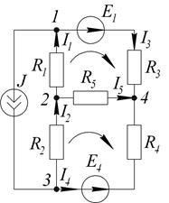 Произвольно выбираем направление токов в ветвях и направление обхода контуров. В схеме шесть ветвей. Необходимо составить систему из