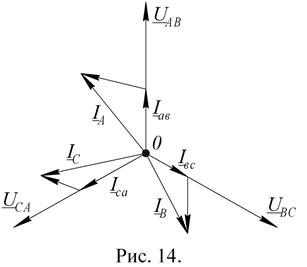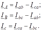 . Линейные токи направлены от источника к приемнику и, как видно из схемы рис. 12, определяются через фазные токи в соответствии с первым законом Кирхгофа следующими выражениями: