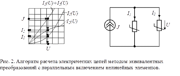 При расчете электрических цепей с последовательным или параллельным включением нелинейных (или линейных и нелинейных) сопротивлений их вольт-амперные характеристики представляются в общей координатной системе и по ним строится общая вольт-амперная характеристика всей нелинейной электрической цепи.