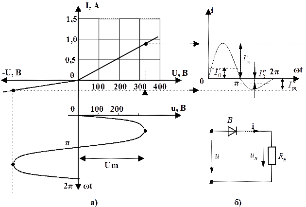, обусловленную этим током, для однополупериодного выпрямителя, собранного на полупроводниковом диоде (рис.4б). Нелинейностью характеристики пренебречь.
