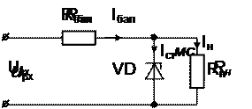 Решение. Согласно схеме,входное напряжение есть сумма напряжений на балластном сопротивлении и стабилитроне. Тогда напряжение на балластном сопротивлении