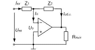 подается входной сигнал. Знаком минус отмечен инвертирующий вход, на который через комплексное сопротивление