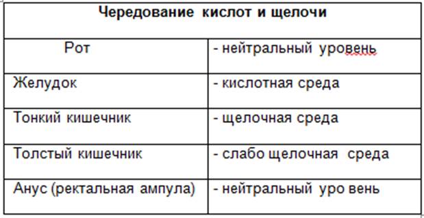 Вообще же в теле существует немало локальных зон, где превалирует кислота. Возьмем пищеварительный тракт. Начиная ото рта до заднего прохода, в пищеварительном тракте поочередно преобладает либо щелочная, либо кислая среда. Если среда слюны слабокислая или нейтральная, то желудочный сок кислый.