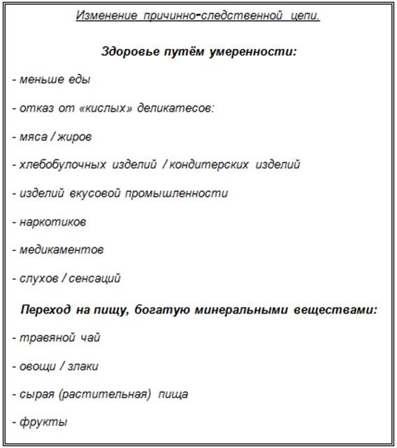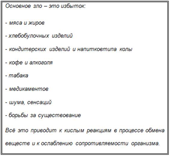 Все эти критерии приводят к химически кислым реакциям организма, к ослаблению сил сопротивляемости и к расхищению запасов минеральных веществ и микроэлементов, данных нам от рождения.
