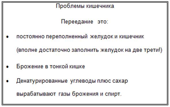 С одной стороны, мы питаемся неправильно, потребляем много животных белков, изделий вкусовой промышленности и упомянутых выше соединений углеводов и сахара, что приводит к непрерывному алкогольному брожению. С другой стороны, мы испытываем недостаток во многих других вещах.
