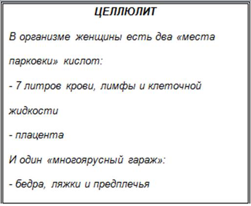 До наступления этого момента женский обмен веществ сохраняет поступающие кислоты - «плохие соки», по словам Хильдегард, - на трёх «стоянках» (мы называем эти места на современный лад – «парковки»). Первая из них - это кровь и лимфа. Вторая - плацента, третья - бёдра, ягодицы и ляжки. «Парковка» № 3 используется только при переизбытке кислот. Она выступает в качестве настоящего «многоярусного гаража». А находящиеся там «машины» - нейтрализованные кислоты (целлюлитные шлаки), которые больше не могут оставаться в крови, лимфе и плаценте.