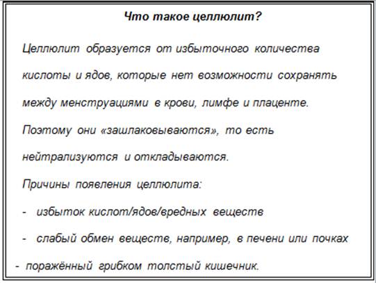 Женский организм обладает менструальным циклом и потому он удерживает кислоты и выводит их во время менструаций. Яды и кислоты, которые больше не могут быть сохранены в крови, лимфе, клеточной жидкости и плаценте, перерабатываются в шлаки, и в этой нейтрализованной форме откладываются в бёдрах, ляжках и предплечьях. Эти шлаки можно растворить и вывести.