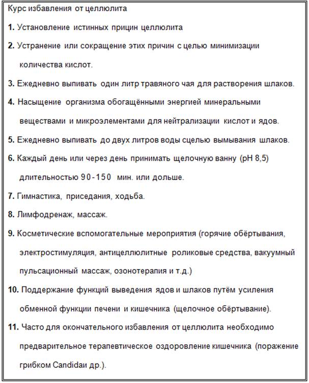 В основе каждого успешного курса лечения целлюлита лежит резкое снижение количества вышеназванных кислот и растворение отложившихся шлаков, образованных из этих кислот! Прежде всего, необходимо снизить количество кислот, поступающих из потребляемых изделий вкусовой промышленности и вследствие неправильного образа жизни. Осуществив это, женщина будет на полпути к успеху! Кислотного «донора» необходимо найти! Курильщице надо уменьшить количество выкуриваемых сигарет, любительнице мяса - ограничить его потребление. Также нельзя допускать физического переутомления и чрезмерного количества болеутоляющих таблеток. Забудьте про шоколад. Кофе пейте не более одной - двух чашек в день. И максимально ограничьте потребление кондитерских изделий, а лучше – откажитесь от них полностью!