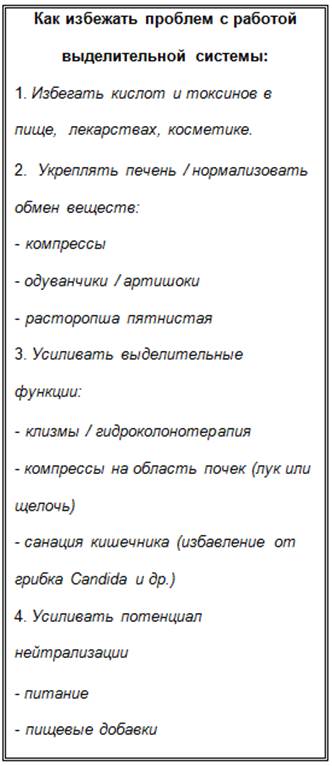 Выведение после процесса нейтрализации нейтральных солей, способных и подлежащих выделению, а, по возможности, и кислот, свободно циркулирующих по организму, осуществляется не только через почки и кишечник, но и через кожу. Именно по этой причине так важно применять различные эффективные щелочные средства по уходу за телом.
