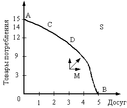 Если абсолютно все ресурсы общество израсходует на производство товаров народного потребления, то можно получить их максимальное количество и полностью отказаться от досуга (точка А), используя тот же ресурсно-технологический максимум, можно достичь обратной ситуации (точка В), когда в обществе существует только индустрия досуга. Между этими крайностями существует множество комбинаций распределения ресурсов и в той и в другой отрасли — точки С, D. Начиная с любой из этих точек, невозможно произвести больше одного товара, не урезая при этом производство другого товара. Объемы производства товаров народного потребления и индустрии досуга не только альтернативны, но и взаимозаменяемы в рамках ограниченных ресурсов.