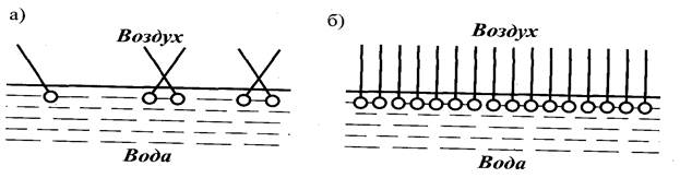 На рис.2 изображено расположение молекул ПАВ в поверхностном слое на границе воды с воздухом. Если концентрация ПАВ мала, то и в поверхностном слое молекул немного ( рис.2, а). При увеличении концентрации ПАВ, его молекулы располагаются перпендикулярно к поверхности воды, образуя сплошной слой (рис. 2, б).
