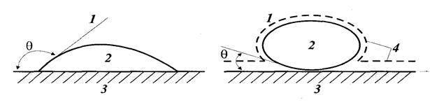 Если ПАВ адсорбируются на поверхности твёрдого тела, то угол смачивания по отношению к воде возрастает и поверхность гидрофоби-зируется.