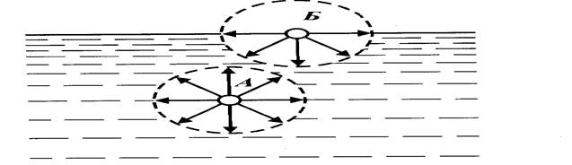 На рис.4 показано, как возникает поверхностное натяжение. На молекулу А, находящуюся в глубине жидкости (вода), со всех сторон равномерно действуют силы межмолекулярного притяжения (за счёт взаимодействия с другими молекулами Н20).