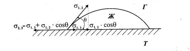 Периметр капли воды на поверхности твёрдого вещества является границей трёх сред - жидкости (1), воздуха (2) и твёрдого тела (3). Поверхность жидкость - воздух имеет поверхностное натяжение — σ1.2, поверхность воздух - твёрдое тело - σ2.3и поверхность жидкость - твёрдое тело - σ1.3Угол между поверхностями жидкость - газ и твердое тело -жидкость называют краевым углом смачивания (θ).