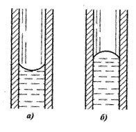 Так, в стеклянной трубке мениск вогнутый (рис.6, а). Если вода не смачивает поверхность, форма мениска выпуклая(рис.6, б).