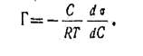 Явление адсорбции на границе с жидкой фазой описывается также теоретическим уравнением Гиббса. Адсорбциявещества на поверхности раздела фаз обозначается Г (вмоль/м2) и зависит от равновесной концентрации вещества врастворе (С). Уравнение Гиббса выражает распределениеадсорбированного вещества между фазой и поверхностью