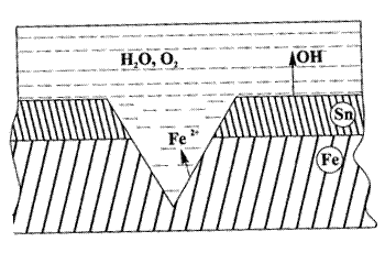 При повреждении покрытия и при наличии электролита возникает гальванический элемент, в котором железо (Е°Fe/Fe2+= - 0,44 В) будет выполнять функцию анода, а олово (Е° Sn/Sn2+ = - 0,14 В) будет катодом.