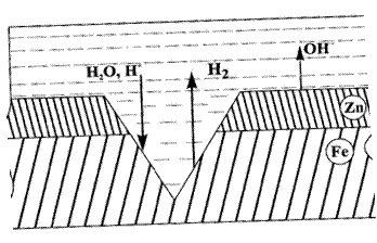 Рассмотрим коррозию оцинкованного железа в кислой среде (рис.16). При нарушении целостности такого покрытия окисляется цинк (Е°Zn/ Zn2+ = - 0,76 В), а на железе (Е°Fe/Fe2+ = - 0,44 В) протекает процесс восстановления ионов водорода.
