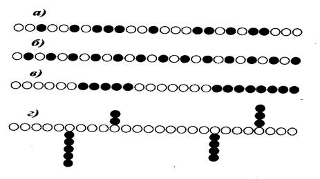 Иногда полимерные цепи бывают построены из разных элементарных звеньев. Такие полимеры называют сополимерами в отличие от гомополи-меров, которые содержат в цепи одинаковые элементарные звенья.Если различные элементарные звенья расположены в главной цепи случайным образом, то сополимеры называются нерегулярными (статистическими). Элементарные звенья могут иметь и строгую последовательность (регулярность). Часто в состав сополимеров входят целые фрагменты (блоки), построенные из элементарных звеньев только одного вида. Такие сополимеры называются блоксополимерами, или привитыми сополимерами (рис.19).