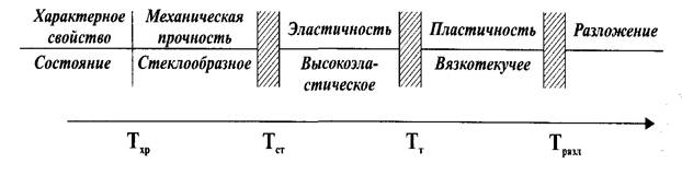 Аморфные полимеры с линейной структурой могут находиться в любом из трех фазовых состояний: стеклообразном, высокоэластичом и вязкотекучем (рис.23) и переходят из одного в другое при изменении температуры. Температурный интервал, в котором происходит переход полимера из высокоэластичного в стеклообразное состояние и обратно, называется температурой стеклования, а интервал перехода из высокоэластичного в вязкотекучее состояние - температурой текучести. При температуре ниже температуры хрупкости полимер разрушается уже при незначительных механических воздействиях, а при температурах выше температуры разложения происходит его термическая деструкция с разрывом макромолекул.