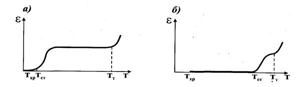 Для определения температурных границ существования этих состояний изучают зависимость деформации полимера от температуры, на основании которой строят термомеханическую кривую Каргина (рис.24). Если температурный интервал Тст - Тт достаточно широк и захватывает обычные температуры, то такие полимеры называют эластомерами, или каучуками (рис.24, а). Полимеры с малым интервалом Тст - Тт, смещенным в область повышенных температур, называют пластомерами, или пластиками (рис.24, б).