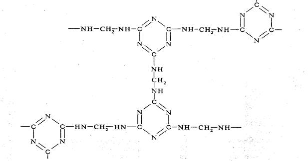Конденсация метилольных производных меламина с большим количеством меламина приводит к получению линейного водорастворимого полимера. Этот полимер при дальнейшей конденсации с избытком формальдегида образует нерастворимый трехмерный сетчатый полимер.